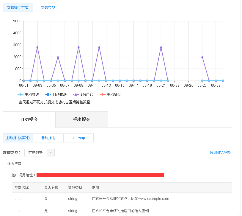 - 在百度站长平台中找到站点接口调用,并将其填写到上述图中所示的站点接口中。请务必将全部内容复制,否则提交将不会成功。如下图中红线框内的信息即为接口调用内容(参考图3)。