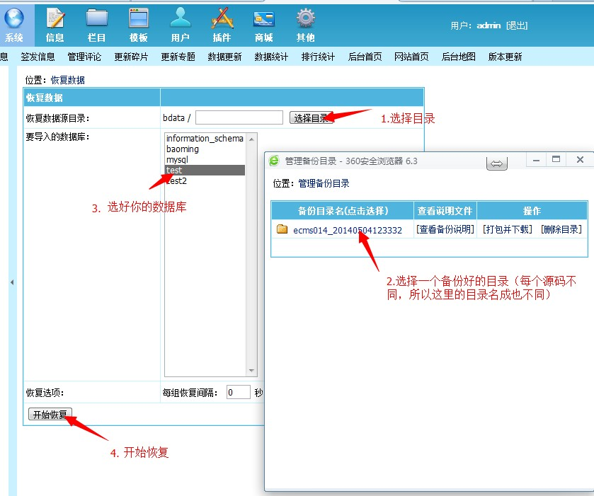 第六步:后台点击 系统→备份与恢复数据→恢复数据,如下图: