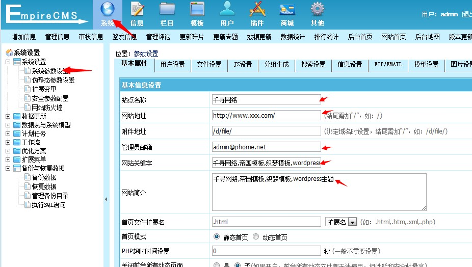 第九步:初次登录后台,要进行一些操作。如下图:设置箭头所指信息为您自己的信息,其中网站地址注意填写正确,一定要http://开头, /结尾。如果没有域名请直接填写一个/ 这里填写错了前台就会显示错误!