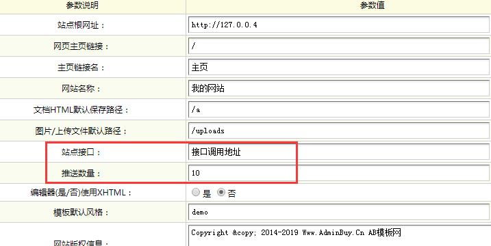 - 安装完成后,在系统的基本参数设置中,您将看到站点接口和推送数量这两个参数(参考图2)。