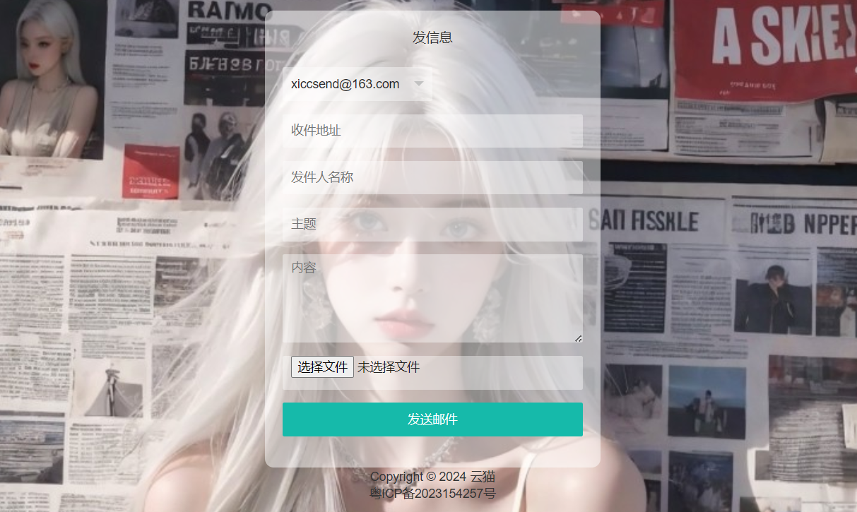 小猫咪在线邮件发送系统源码v1.1免登录邮件发送系统源码,支持添加附件,后台可添加邮箱,前台可选择发送邮箱安装教程:1.源码上传服务器2.登录后台,添加发送邮箱即可3.后台地址:域名/admin.php 默认账号密码为admin/123456,安装完建议修改4.网站数据采取本地保存,所以使用前请给网站修改权限,否则很多功能将无法使用 内容加载中..